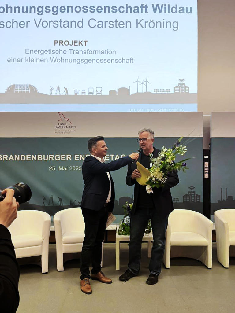 „Die WGW Wohnungsgenossenschaft Wildau eG erhielt für ihre energetische Transformation einer kleinen Wohnungsgenossenschaft den Sonderpreis. Bei den Sanierungen wurden unter anderem Photovoltaikanlagen auf den Dächern der Mietshäuser installiert. Solarer Mieterstrom wird direkt den Mietern zur Verfügung gestellt. Die Nutzung des Eigenstroms spart den teilnehmenden Mietern ca. 15% ihrer Stromkosten und nebenbei werden Umwelteffekte generiert. Zudem wurden zwei Heizhäuser errichtet. Das erste arbeitet auf Basis von Erdgas. Das zweite Heizhaus hat keinen Gasanschluss, sondern wird aus der Kombination von Wärmepumpentechnik und Photovoltaik auf den anliegenden Wohngebäude- und Garagendächern versorgt. Beide Heizhäuser sind technisch miteinander verbunden. Der Vorteil von zwei unabhängig voneinander, mit unterschiedlichen Energiequellen arbeitenden Heizhäusern: Es gibt eine Fallback-Lösung, falls die eine oder andere Energiequelle unökonomisch wird oder ausfallen sollte.“1