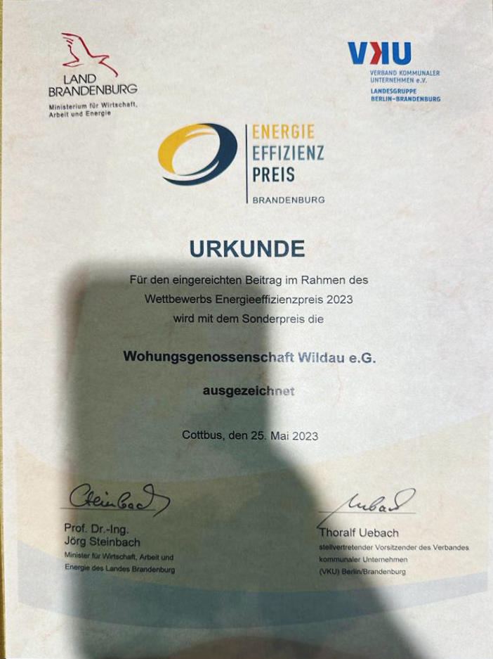 Im Rahmen des am 25.Mai 2023 in Cottbus stattgefundenen „Energietag Brandenburg“ wurde durch den Minister für Wirtschaft, Arbeit und Energie des Landes, Herrn Prof. Dr. Jörg Steinbach der „ENERGIEEFFIZIENZPREIS“ des Landes Brandenburg vergeben.