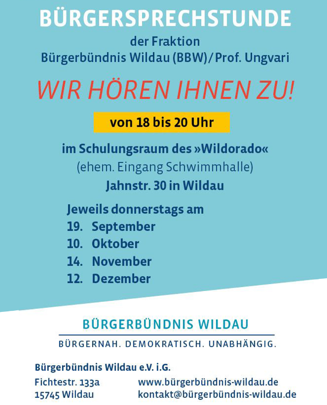 wir möchten Sie herzlich zur nächsten Fraktionssprechstunde einladen! Diese findet am 14.11. von 18 bis 20 Uhr im Schulungsraum des Wildorados (ehem. Eingang Schwimmhalle), Jahnstr. 30, statt.